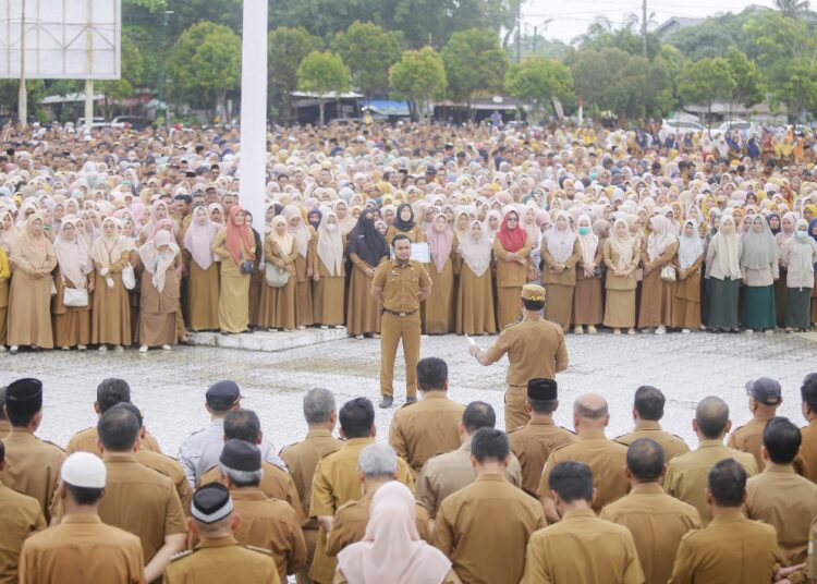 Bupati Aceh Timur Iskandar Usman Al-Farlaky Apel perdana bersama dengan ribuan ASN. (Foto: Ist).